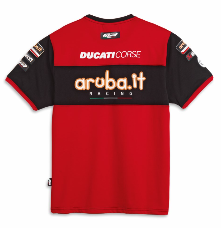 Show your passion for the Reds of Ducati Panigale in every place you go, with the exclusive t-shirt featuring the design of the one used by the official team Aruba.it Racing - Ducati in the Superbike World Championship. Comfortable sports style in the iconic racing colors of red and black, featuring patches, embroideries and prints from sponsors and the racing world. Perfect for a casual outfit that still reflects your passion for the Reds of Borgo Panigale.
